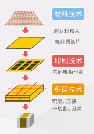 片式多層瓷介電容器簡稱片式電容器,是由印好電極(內(nèi)電極)的陶瓷介質(zhì)膜片以錯位的方式疊合起來,經(jīng)過一次性高溫燒結形成陶瓷芯片,再在芯片的兩端封上金屬層(外電極),從而形成一個類似獨石的結構體。